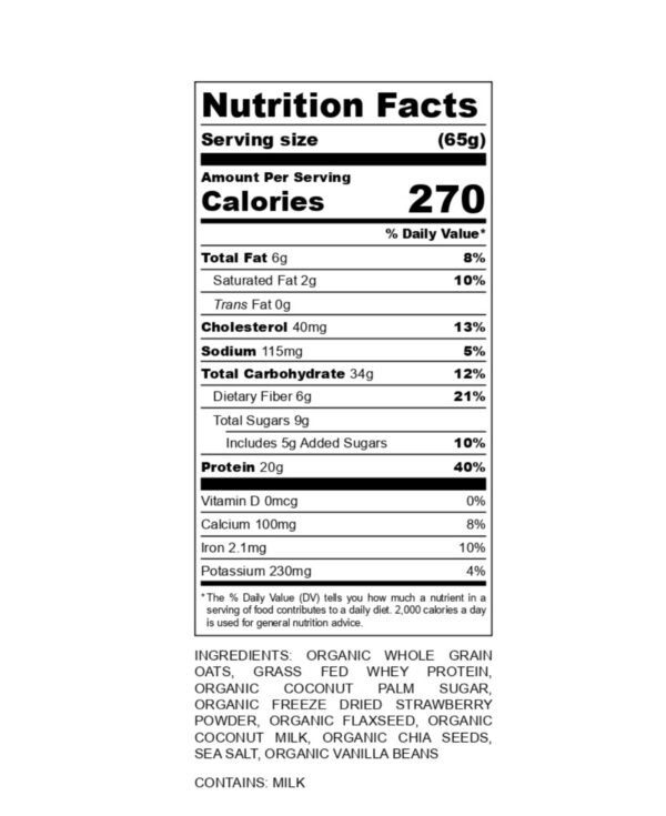 Freeze-dried strawberries bring bright, tart-sweet sparkle, rounded by real vanilla’s soft warmth. Grass-fed whey protein adds clean, silky strength—20g protein per serving—for a creamy, satisfying bowl with fresh berry lift and a smooth finish.