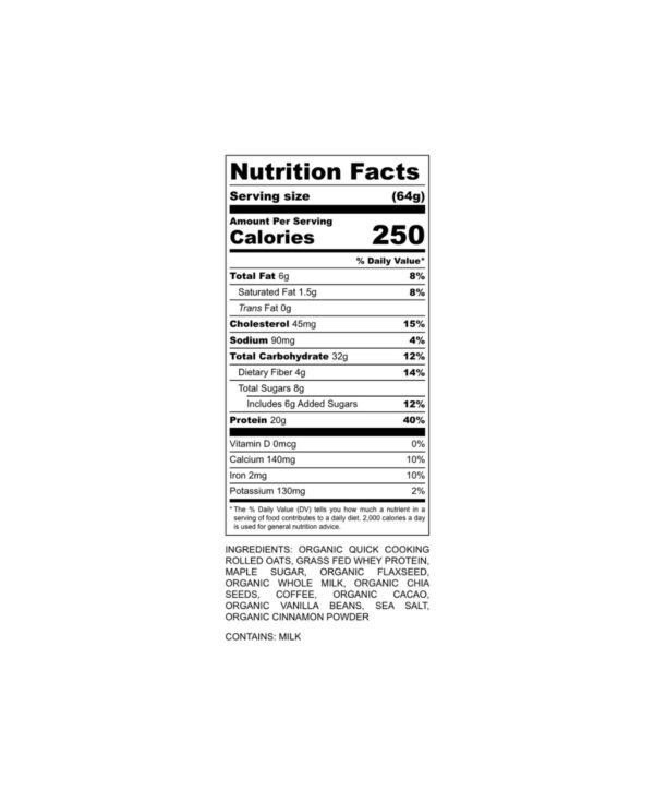 Bold coffee leads with a crisp cinnamon edge, balanced by unsweetened cocoa and organic oats for a clean mocha finish.
